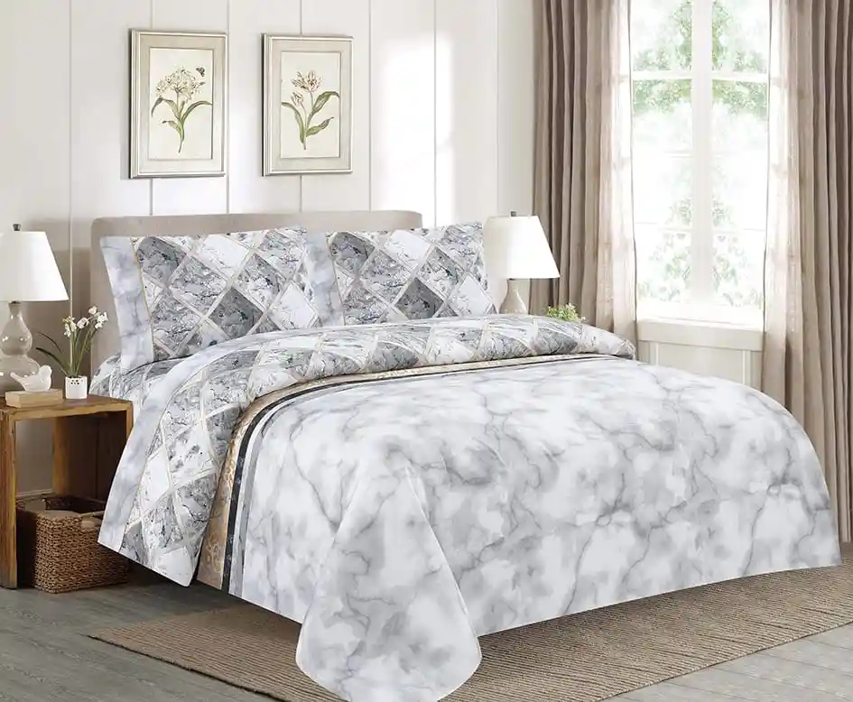 Juego de sábanas Estampadas cama doble Excelente calidad con renovados diseños para que le des ese toque personal a tu hogar. Características: -Para uso en cama doble -Medidas 1.40x1.90x30 Cm Aprox, 2 fundas 54x76 Cm -Elaboradas en microfibra 100% poliéster -Textura suave y placentera -No destiñen -No motosean -Planchado permanente -Con embone decorativo que les da un toque de elegancia -Variados diseños