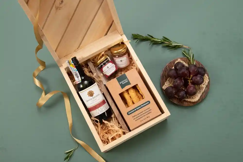 Piba de vino tinto (187 ml) acompañada de unos grissinis con queso parmesano (90g aprox) para untar con dos confituras, una de vino tinto y otra de vino rosado (30 ml cada una)