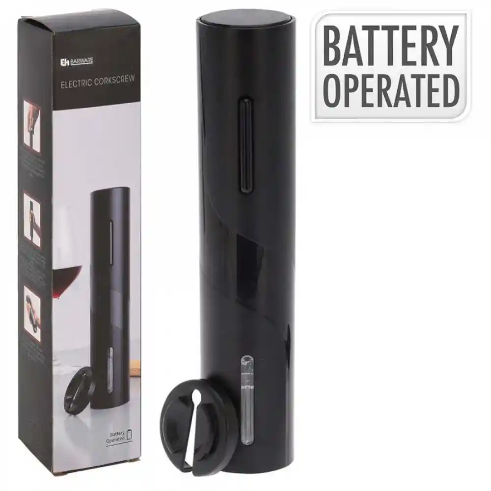 Sacacorchos Excellent houseware Medidas: 23cm alto Color: negro Material: Policarbonato y aluminio Atributos adicionales: Eléctrico, funciona con 4 baterias AA (no incluidas), con cortador de lámina. No apto para microondas No apto para lavavajillas. sku: 215724