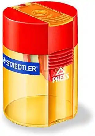 ● Sacapuntas Staedtler doble orificio Original Tajalápiz Metálico Sacapunta doble ● Sacapuntas de doble orificio para lápices de tamaño estándar de hasta 8,2 mm de diámetro con un ángulo de afilado de 23 grados. ● Viene en una variedad de combinaciones de colores: tapa verde/cubeta azul, tapa amarilla/cubeta verde, tapa roja/cubeta amarilla, tapa azul/cubeta roja. ● Para lápices gruesos de hasta 10,2 mm de diámetro con un ángulo de afilado de 30 grados. ● La cubierta con bisagras evita que se derramen las virutas. ● Tapa con cierre de seguridad para evitar aperturas accidentales.
