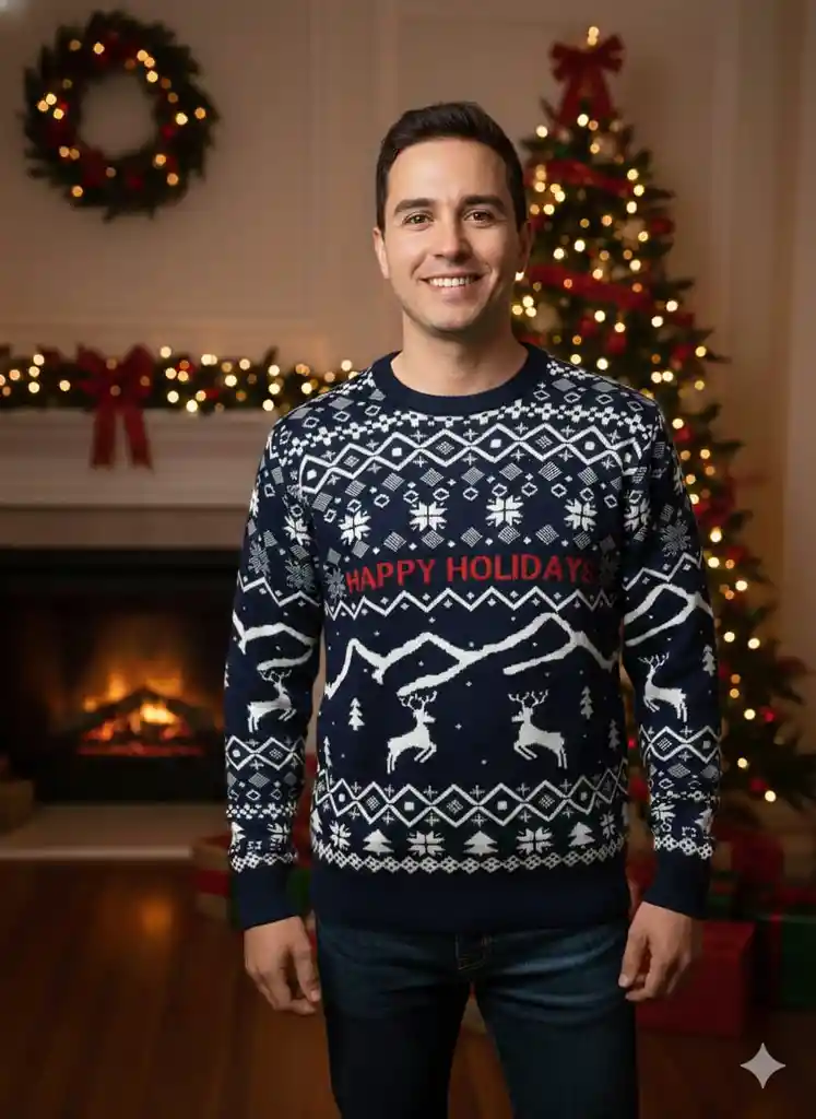Saco Navideño Tejido Cómodo Caballero – Azul Marino – Diseño “Happy Holidays” Copos de Nieve, Renos y Árboles – Talla XL ¡Celebra la temporada con estilo y comodidad! 🎄🧣 Este saco navideño para caballero, en elegante azul marino, destaca por su diseño festivo con la frase “Happy Holidays” acompañada de copos de nieve, renos y árboles navideños. Su tejido suave y abrigado proporciona calidez sin perder ligereza, ideal para reuniones, cenas navideñas o fotos familiares. Características destacadas: 🧵 Material tejido suave, cómodo y agradable al tacto. 🎄 Diseño navideño completo, con “Happy Holidays” y patrones clásicos como árboles, renos y copos de nieve. 👔 Corte para caballero, cómodo y de ajuste tradicional. 🎨 Color: Azul marino con detalles en blanco y tonos festivos. 📏 Talla: XL. 🎁 Ideal para celebraciones, eventos navideños, regalos y fotos familiares. Un saco elegante, cálido y lleno de espíritu navideño para disfrutar la temporada con estilo. ✨
