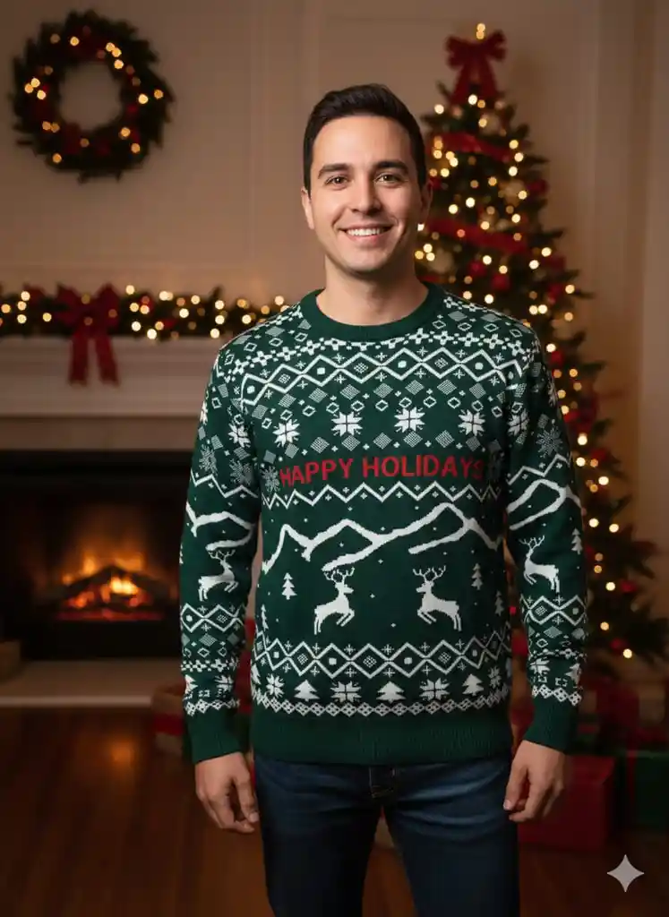 Saco Navideño Tejido Cómodo Caballero – Verde Navideño – Diseño “Happy Holidays” Copos de Nieve, Renos y Árboles – Talla L ¡Perfecto para celebrar la Navidad con estilo y comodidad! 🎄🧣 Este saco para caballero, en un elegante verde navideño, presenta un diseño festivo con la frase “Happy Holidays”, acompañado de copos de nieve, renos y árboles decorativos. Su tejido suave, cálido y ligero lo convierte en una prenda ideal para reuniones, cenas navideñas, fotos familiares o eventos de temporada. Características destacadas: 🧵 Material tejido suave, cómodo y agradable al tacto. 🎄 Diseño navideño completo, con árboles, renos, copos de nieve y la frase “Happy Holidays”. 👔 Corte para caballero, moderno y de ajuste clásico. 🎨 Color: Verde navideño con detalles en blanco y tonos festivos. 📏 Talla: L. 🎁 Ideal para celebraciones, fotos navideñas, reuniones familiares y como regalo especial. Un saco festivo, elegante y lleno del espíritu navideño, perfecto para disfrutar la temporada con alegría. ✨