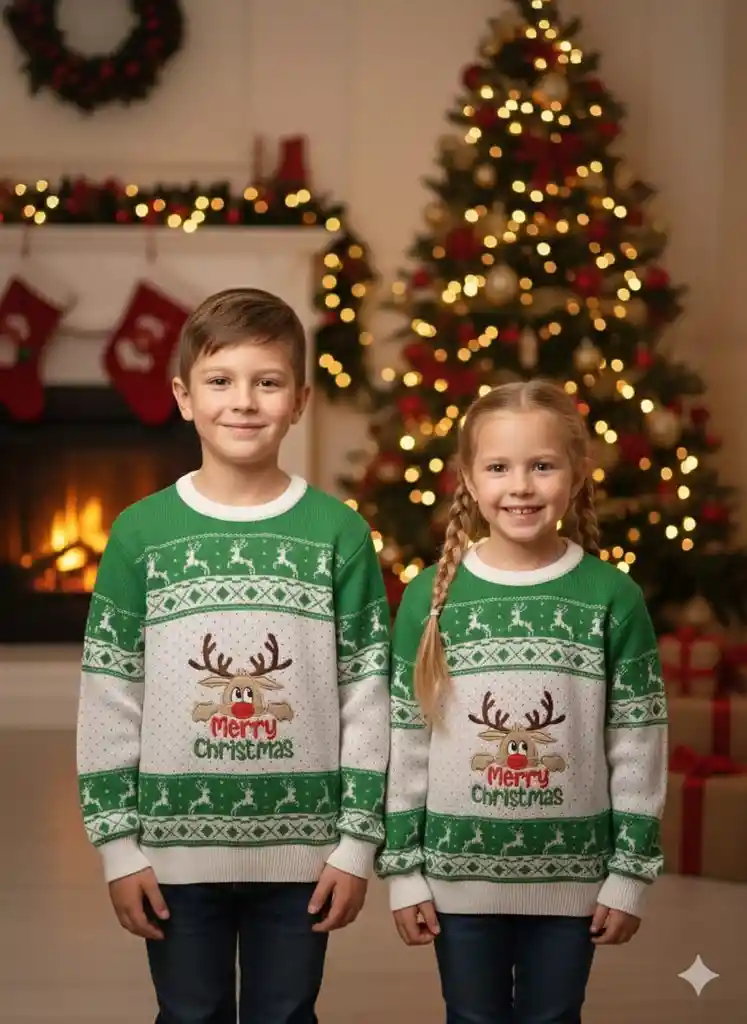 Saco Navideño Tejido Cómodo Niño - Niña – Diseño Verde Reno Navidad – Talla 16 ¡Perfecto para vivir la magia navideña con estilo y comodidad! 🎄🧣 Este saco tejido, ideal para niños y niñas, destaca por su vibrante color verde y un tierno diseño de reno navideño, creando un look festivo, cálido y encantador para la temporada. Características destacadas: 🧵 Material tejido suave, ligero y cómodo para uso diario. 🦌 Diseño navideño de reno al frente, acompañado de patrones clásicos como copos de nieve y figuras decorativas. 👧👦 Apto para Niño y Niña: estilo versátil y cómodo. 🎨 Color: Verde con detalles en blanco, rojo, beige y café. 📏 Talla: 16. 🎁 Ideal para celebraciones navideñas, fotos familiares, eventos escolares y como regalo especial. Un saco festivo, alegre y lleno de encanto para que los pequeños disfruten la Navidad con estilo. ✨