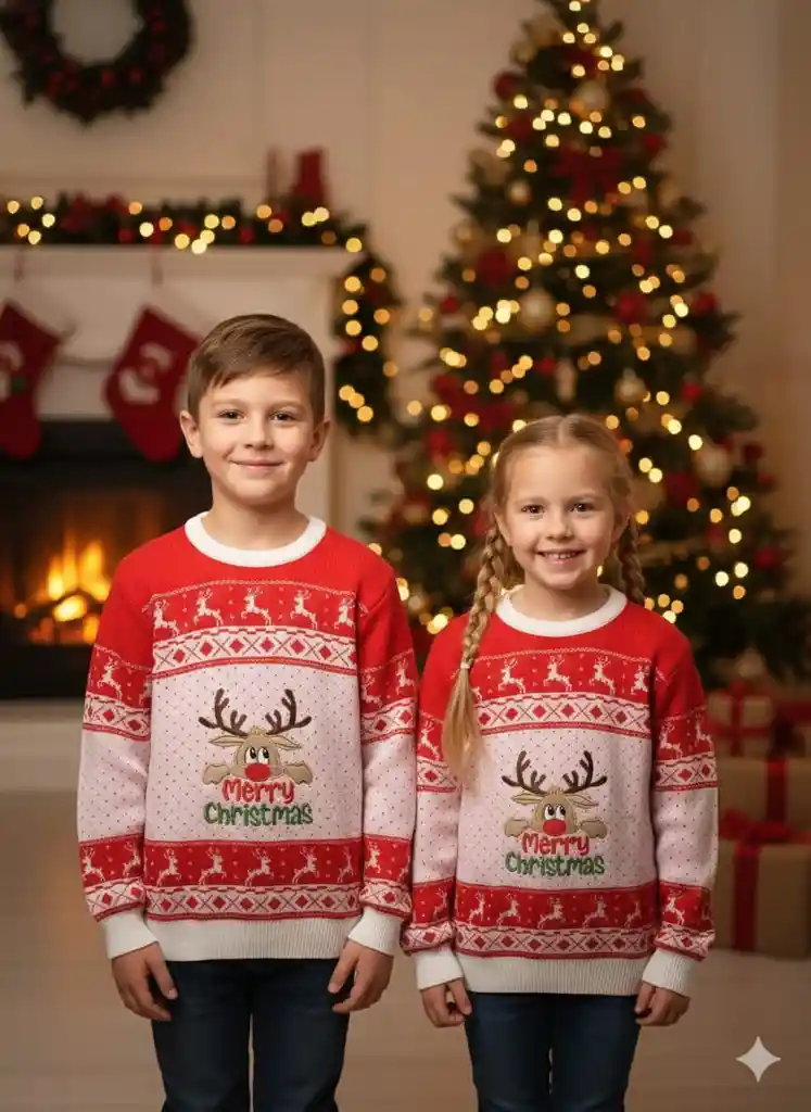 Saco Navideño Tejido Cómodo Niño - Niña – Diseño Rojo Reno Navidad – Talla 16 ¡Perfecto para que los pequeños vivan la magia de la Navidad! 🎄🧣 Este saco infantil, en un vibrante color rojo, cuenta con un adorable diseño de reno navideño al frente, acompañado de detalles festivos que lo hacen ideal para la temporada. Su tejido suave y ligero brinda comodidad durante todo el día, ideal para celebraciones, fotos familiares o actividades escolares. Características destacadas: 🧵 Material tejido suave y cómodo, ideal para clima fresco. 🦌 Diseño navideño de reno con detalles clásicos como copos de nieve, pinos y patrones decorativos. 👧👦 Apto para Niño y Niña: estilo versátil y moderno. 🎨 Color: Rojo con detalles en blanco, café, negro y verde. 📏 Talla: 16. 🎁 Perfecto para fotos, reuniones familiares, festivales navideños y como regalo especial. Un saco cálido, festivo y encantador, ideal para que los niños disfruten la Navidad con estilo. ✨