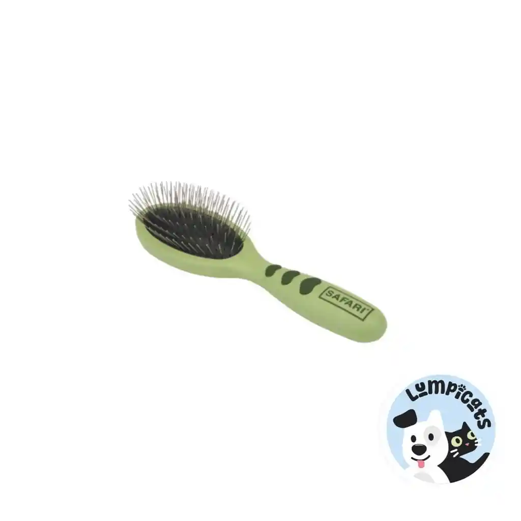 El Safari Perro Cepillo Pines Large es un cepillo diseñado especialmente para el cuidado del pelaje de perros, particularmente aquellos con pelaje largo o denso. Está fabricado con pines metálicos de alta calidad, lo que permite desenredar y eliminar eficazmente nudos y enredos sin dañar la piel o el pelaje del animal. Características principales: Pines metálicos de acero inoxidable: Son suaves con la piel del perro pero lo suficientemente fuertes como para deshacer los enredos o nudos del pelaje. Diseño ergonómico: El mango del cepillo está diseñado para brindar un agarre cómodo y seguro durante el uso, lo que facilita el proceso de cepillado. Tamaño Large: Ideal para perros de razas grandes o aquellos con pelajes largos y gruesos. El tamaño del cepillo asegura que se cubra una mayor superficie en menos tiempo. Reducción de la caída de pelo: Al usar este cepillo con regularidad, se ayudan a reducir la cantidad de pelo muerto que se acumula, lo cual es útil para mantener la casa más limpia.