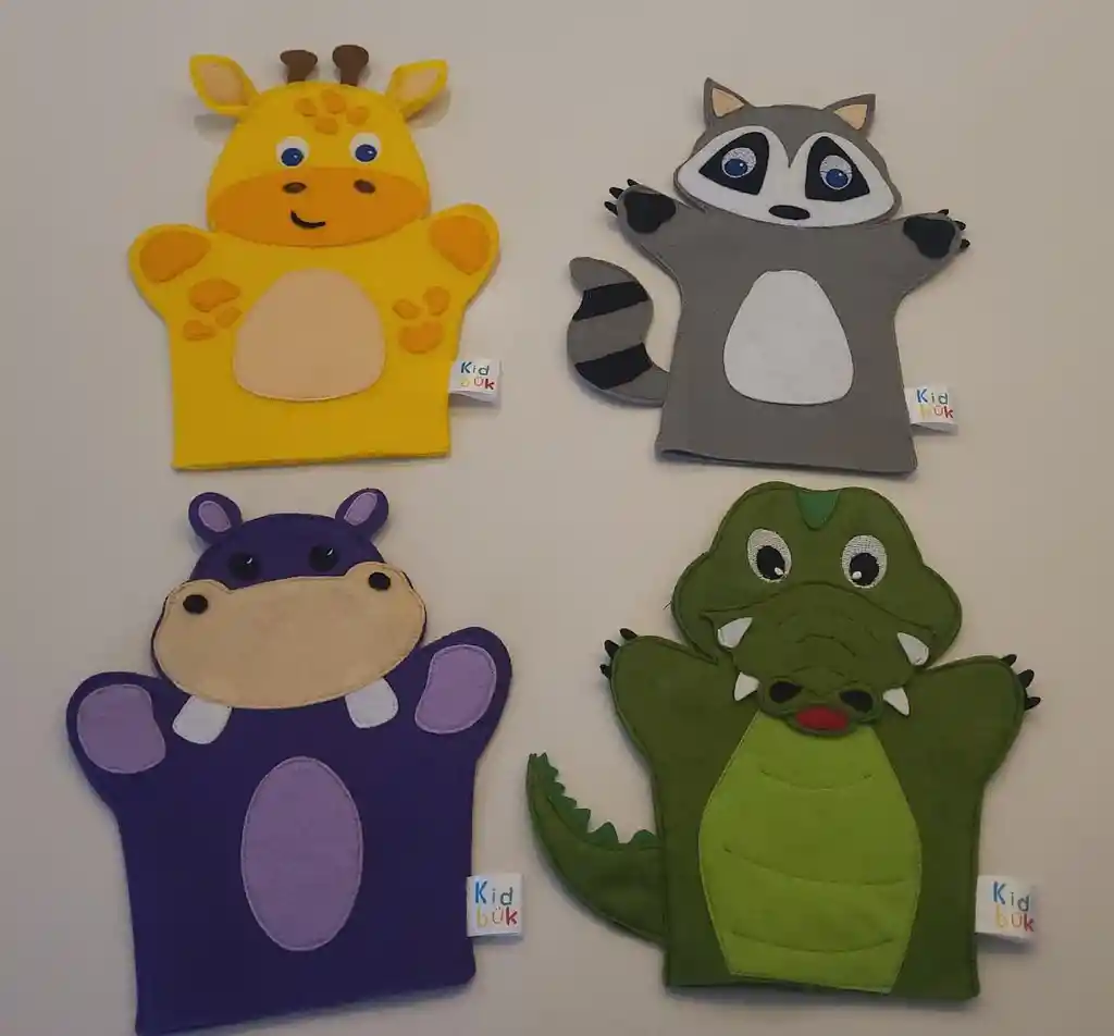 La creatividad y la imaginación hacen parte fundamental para el desarrollo del lenguaje de los niños, por eso nuestros títeres llegan para ayudar a crear historias y cuentos mágicos. Son 4 amigos de la selva que vienen en su bolsa Kidbuk, la jirafa, el mapache, el hipopotamo y el cocodrilo.Títeres hechos en paño lency para las manos de 25 cm de alto.
