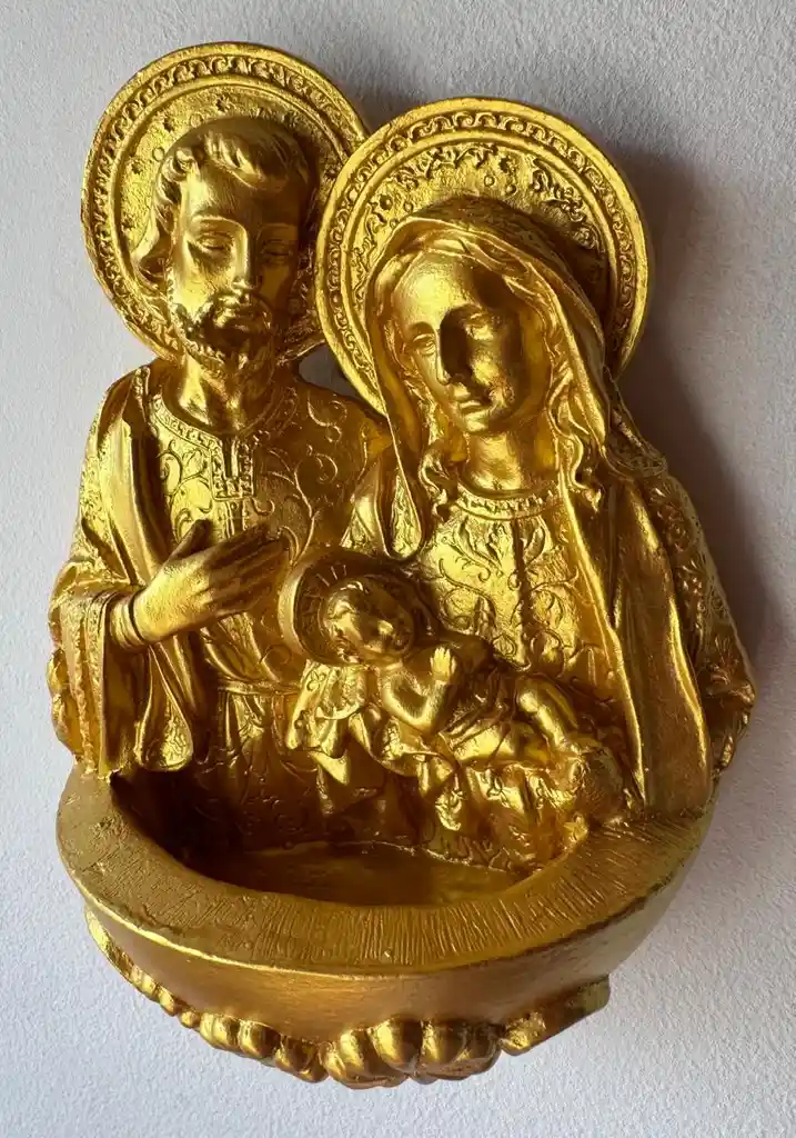 Embellece tus espacios con esta majestuosa figura de la Sagrada Familia en acabado dorado, una pieza que irradia amor, protección y armonía. Representando a la Virgen María, San José y el Niño Jesús, esta obra transmite un profundo mensaje de unión familiar y fe. Diseñada con un delicado recipiente frontal, es ideal para colocar agua bendita, convirtiéndola en un elemento funcional y espiritual para tu hogar. Su acabado dorado brillante aporta un toque sofisticado y especial que resalta en cualquier ambiente. Perfecta para altares, entradas del hogar o espacios de oración, esta pieza es también un regalo significativo cargado de simbolismo. 💫 Características: • Figura de la Sagrada Familia • Incluye recipiente para agua bendita • Acabado dorado elegante • Material resistente y duradero • Ideal para decoración religiosa o uso devocional