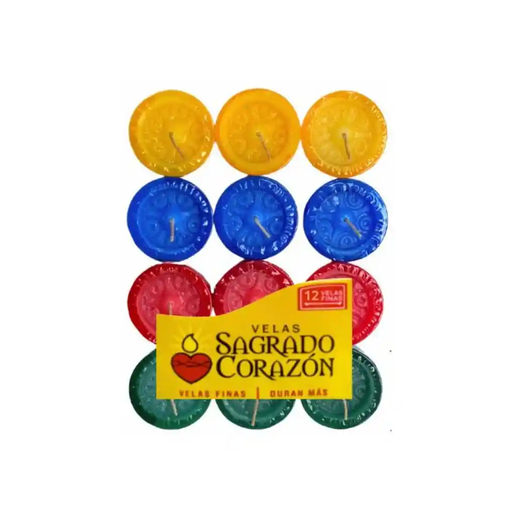 Contiene 12 velones (Amarillos, Rojo, Verde y Azul)