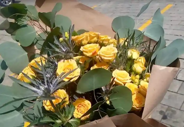 • 20 rosas. • 1 paquete de eringio. • 1 paquete de eucalipto silver dollar. No incluye Jarrón/canasta. El color de la flor puede variar