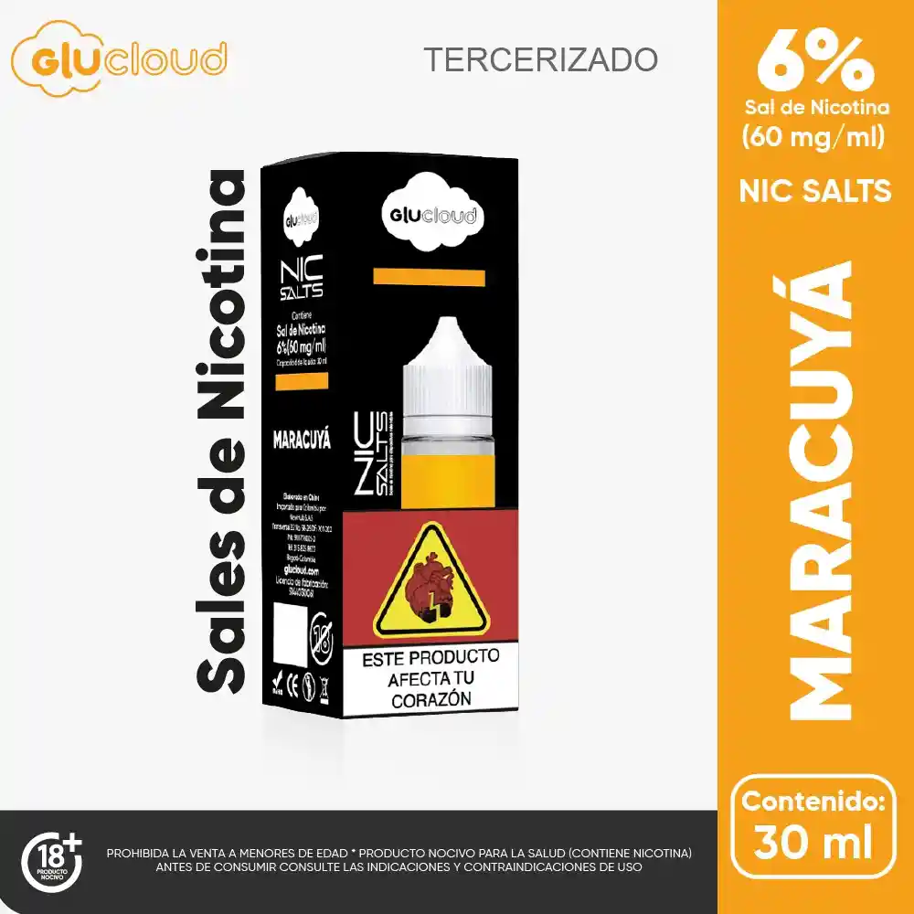 Sal de Nicotina sabor Maracuya 6% concentración de Nicotina. Marca Glucloud. Volumen de líquido: 30 ml. Prohibida la venta a menores de edad. Producto nocivo para la salud que contiene nicotina, sustancia altamente adictiva. Antes de consumir consulte las indicaciones y contraindicaciones de uso.