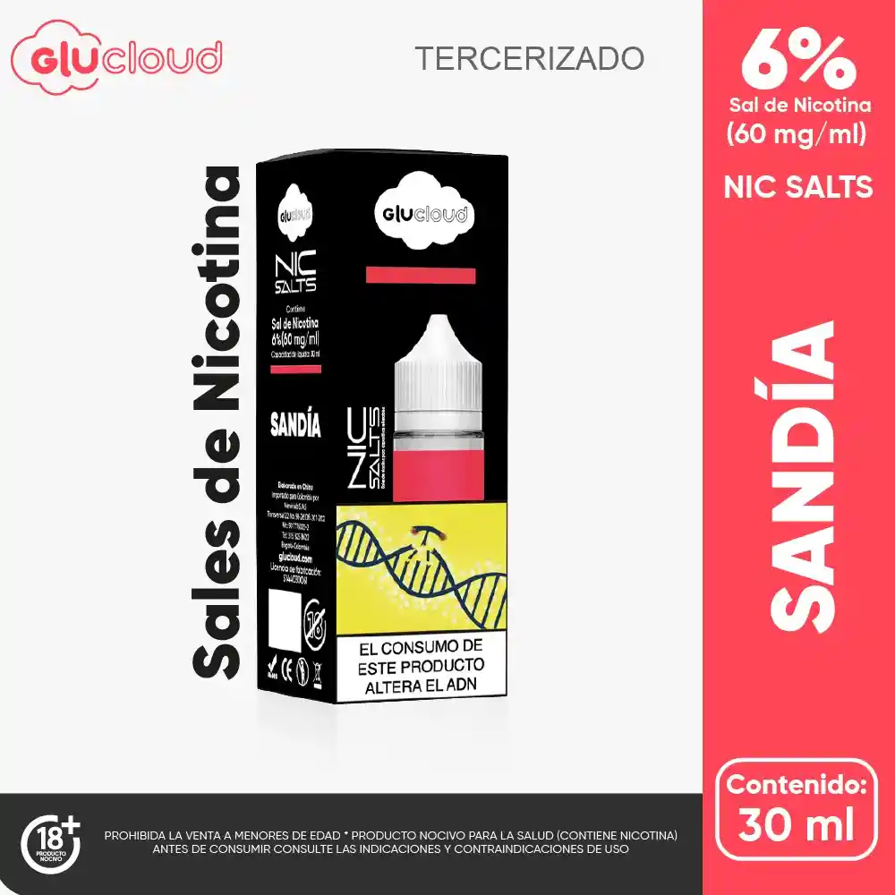 Sal de Nicotina sabor Sandia 6% concentración de Nicotina. Marca Glucloud. Volumen de líquido: 30 ml. Prohibida la venta a menores de edad. Producto nocivo para la salud que contiene nicotina, sustancia altamente adictiva. Antes de consumir consulte las indicaciones y contraindicaciones de uso.