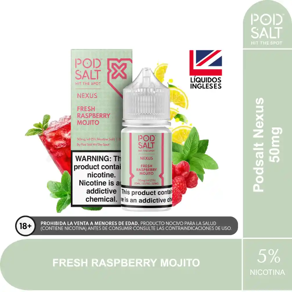 Sal de Nicotina sabor Fresh Raspberry Mojito Ice 5% concentración de Nicotina. Marca Podsalt. Volumen de líquido: 30 ml. Prohibida la venta a menores de edad. Producto nocivo para la salud que contiene nicotina, sustancia altamente adictiva. Antes de consumir consulte las indicaciones y contraindicaciones de uso.