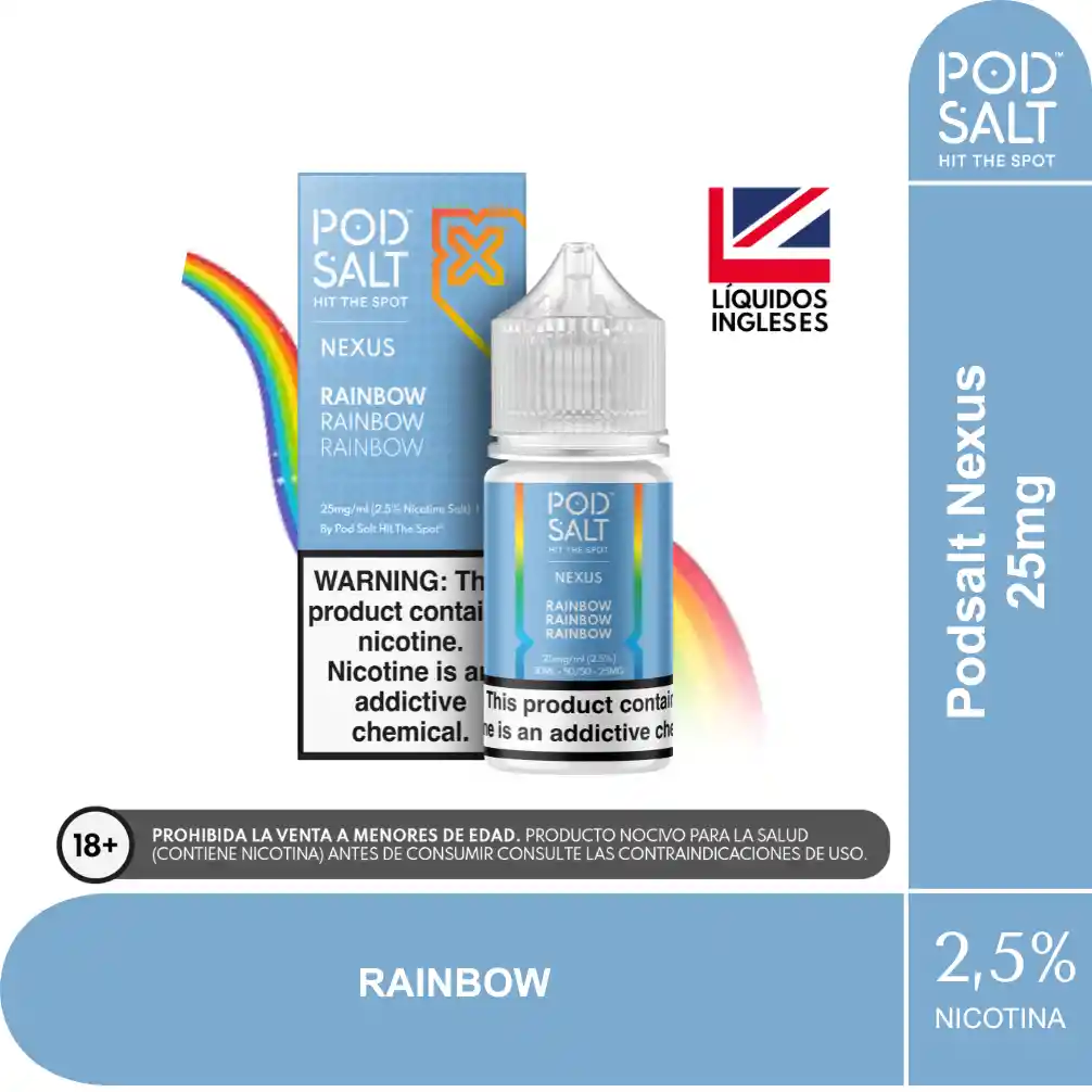 Sal de Nicotina sabor Rainbow 2,5% concentración de Nicotina. Marca Podsalt. Volumen de líquido: 30 ml. Prohibida la venta a menores de edad. Producto nocivo para la salud que contiene nicotina, sustancia altamente adictiva. Antes de consumir consulte las indicaciones y contraindicaciones de uso.