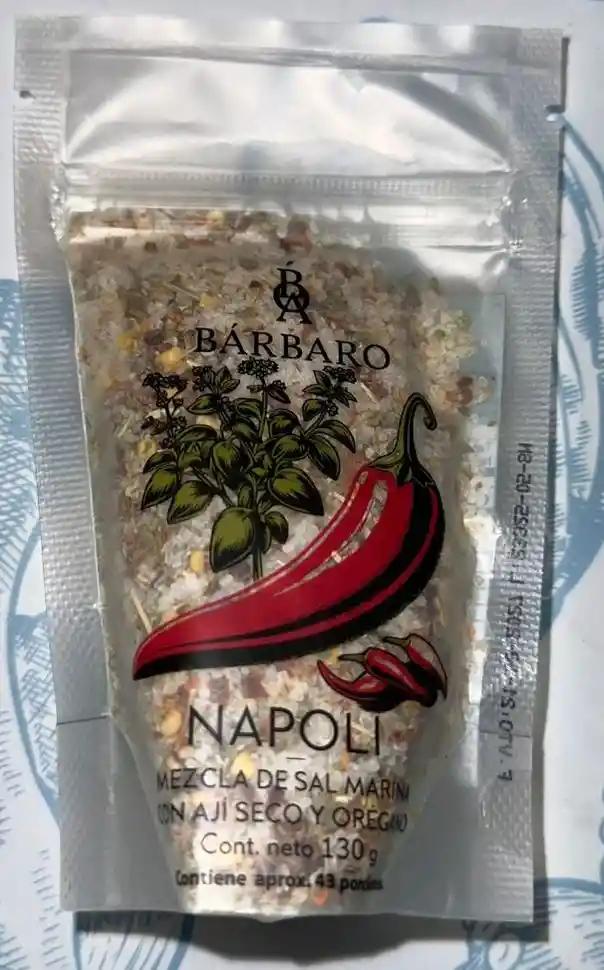 Mezcla de sal marina con ají seco y orégano, empacadas por 130 gramos.