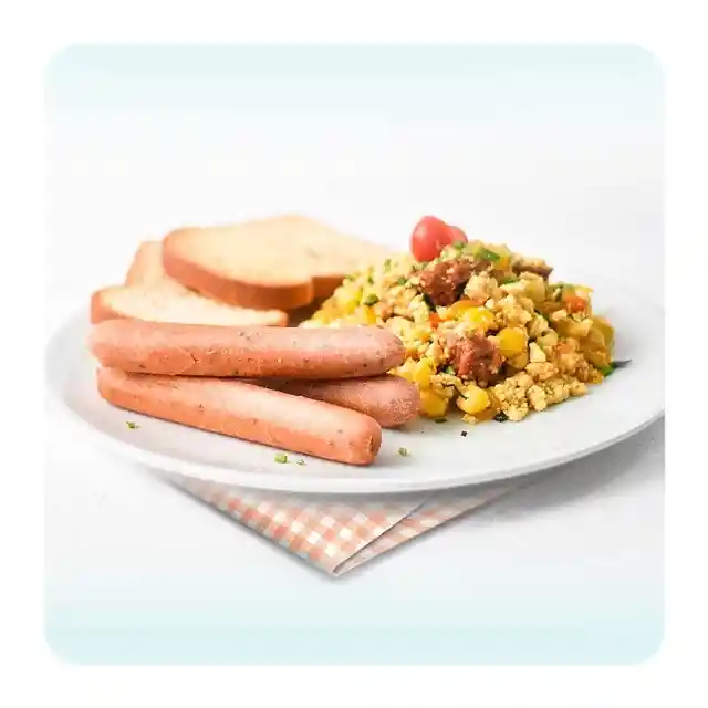 Ingredientes: soya, cereales (trigo), leguminosas (arveja), linaza, ajonjolí, sal, saborizante imitación a salchicha, Colorante (eritrosina), sorbato de potasio (conservante).