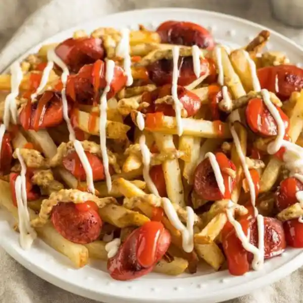 Papa a la francesa, salchicha, carne de res, queso, tocineta, maicitos, lechuga, ripio y salsas.