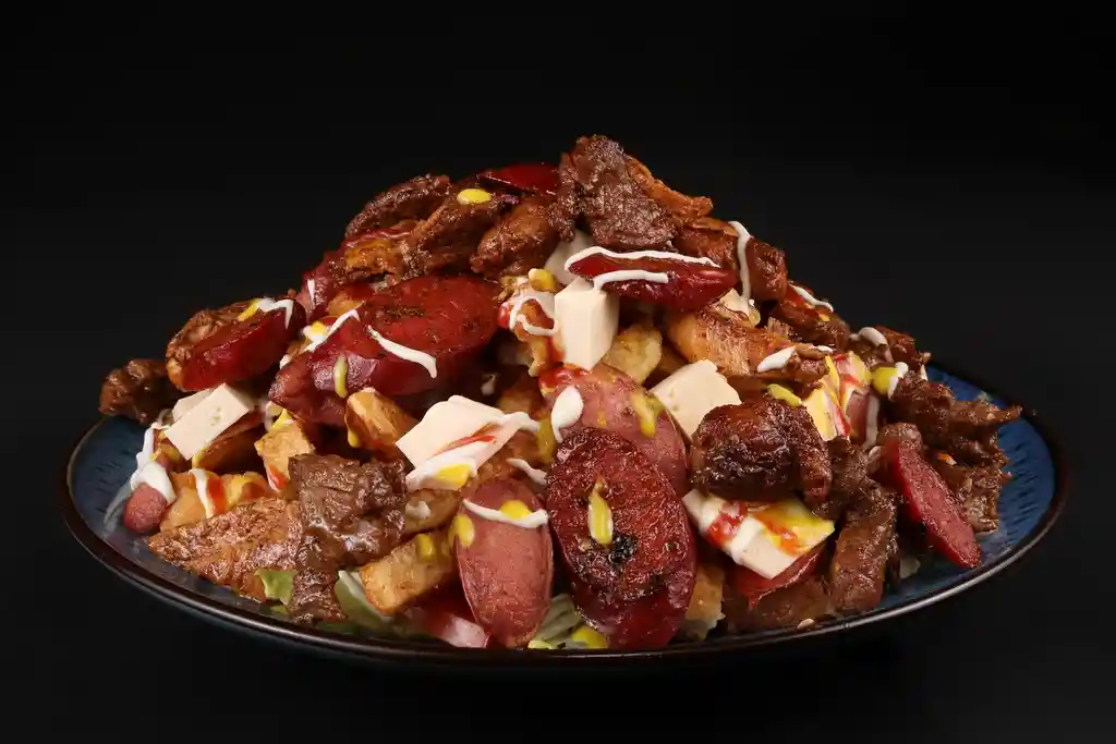 Papa, Salchicha Long, Huevo de Codorniz, Doble Queso, Cerne de res, Carne de Cerdo, pollo, salsas.