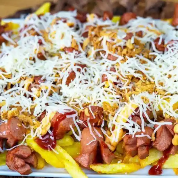 Papa a la francesa, salchicha, queso, ripio, salsas, costilla, tocineta, carne de res, chicharrón, pechuga de pollo y mucho más queso