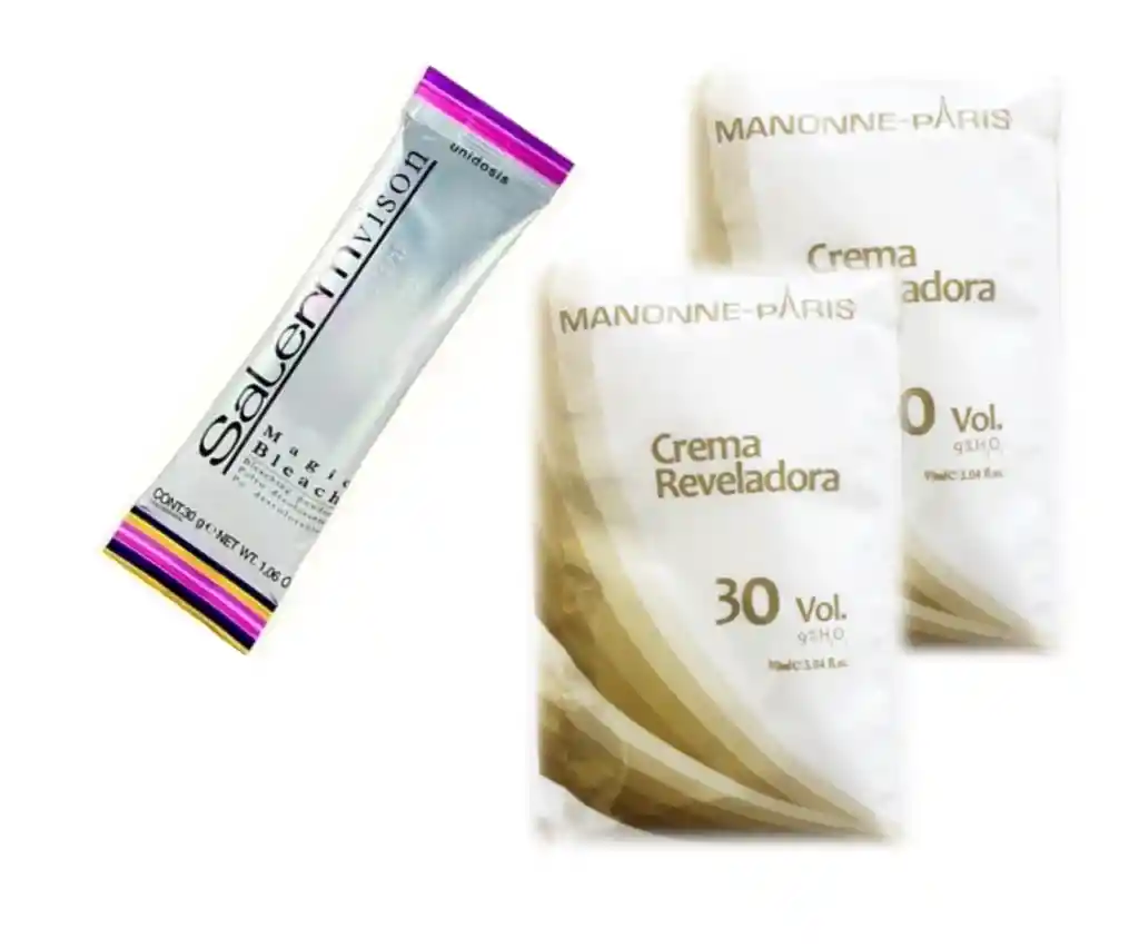 Kit Decolorante (4:1) 9 Tonos: Decolorante 42gr + 2 Oxigenta 90ml SALERM CONTIENE: - SACHET 42 GR - CREMA REVELADORA 90ML (30VL) (2 UNIDADES) Decoloración en polvo de alto rendimiento (proporción 1:4, es decir, por cada porción de decolorante se requiere 4 porciones de oxigenta) Aclara tonos con uniformidad tanto sobre cabellos teñidos como naturales Magic Bleach es un decolorante en polvo de alto rendimiento con acción de aclarado progresivo capaz de obtener niveles muy claros (9 tonos) con total protección del cabello y con reflejos más neutros. Gracias a su composición con avena rica en oligoelementos, añade un plus de hidratación y suavidad al cabello. Modo de uso: - Se mezcla 42gr de decolorante en polvo con 150gr a 200gr de oxigenta y se deja actuar de 30min hasta 1 hora. Se retira con agua.