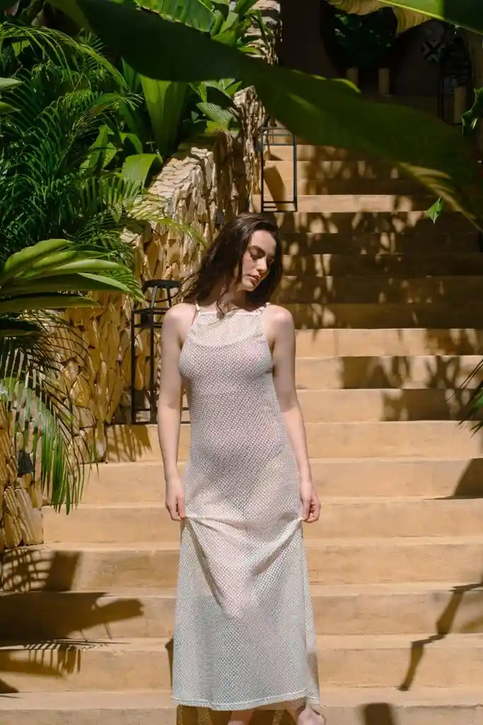 Hermosa salida de baño larga en tela tipo malla , color beige
