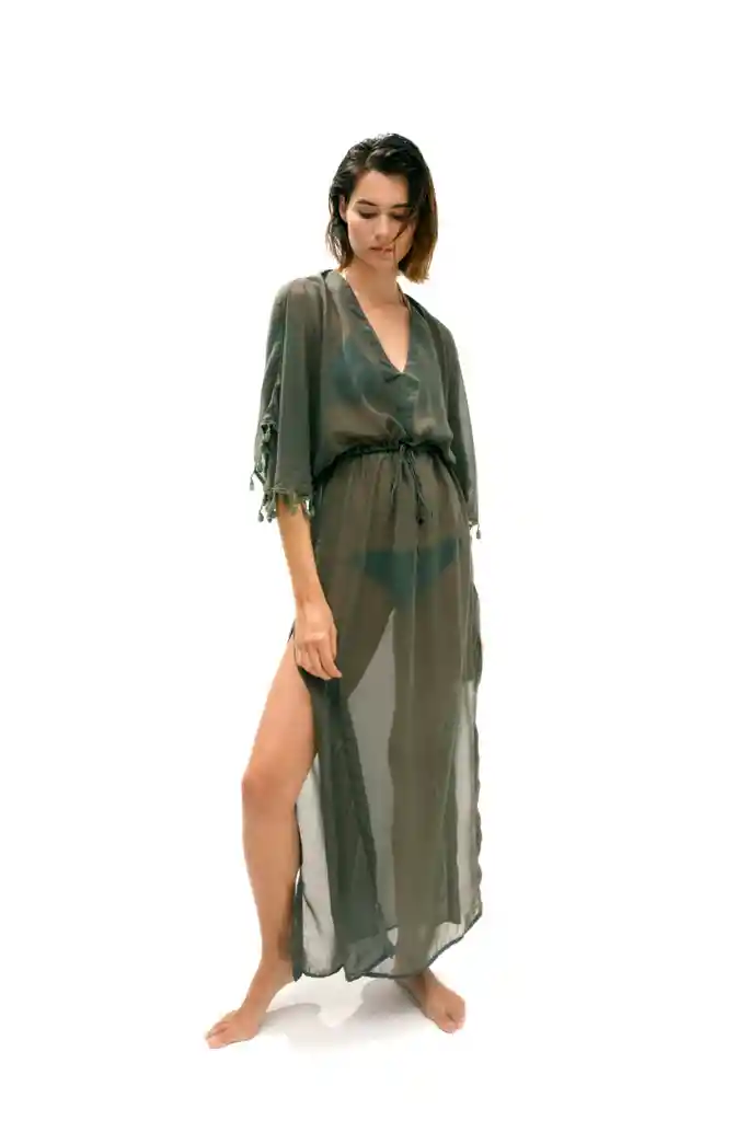 Salida De Baño Larga Tipo Túnica. Su Material Translúcido Muy Fresco, Genera Una Lindas Transparencias Y Las Mangas Que Están Terminadas En Elegante Encaje Guipure / O Borlas Dan Un Toque Sofisticado Y Mucho Estilo. Ideal Para Usar En La Playa, En La Piscina.