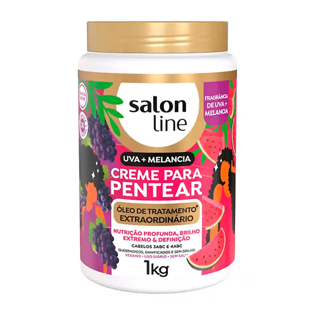 Descubre Salon Line Crema para Peinar Uva + Sandía, diseñada para hidratar profundamente tu cabello mientras controla el frizz y potencia la suavidad natural. Su fórmula nutritiva ayuda a reparar puntas dañadas y aporta brillo saludable, mientras su fragancia frutal envuelve tu rutina de cuidado capilar en una experiencia sensorial única. Ideal para todo tipo de rizos y cabellos ondulados, fortalece la fibra capilar, facilita el peinado y protege contra el encrespamiento, dejándolo manejable, hidratado y lleno de vida día tras día.