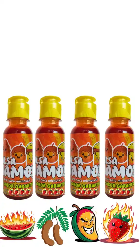 La salsa chamoy es un aderezo agridulce picante ideal para acompañar frutas gomitas micheladas y snacks presentación de botella 120ml x 4 unidades en cuatro sabores diferentes mango viche, tamarindo,sandía,pikafresa