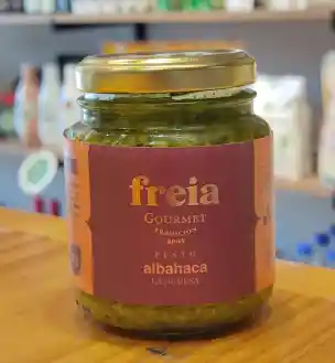 Salsa pesto a base de albahaca organica, aceite de oliva extra virgen, almendras. Ideal para ensaladas, pastas, pizza, sandwich, pasabocas, carnes, pescados. 100% artesanal