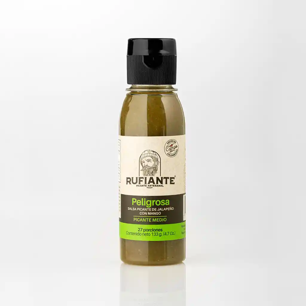 Hecha de Jalapeño y Mango NIVEL DE PICANTE MEDIO. Explosiva combinación frutal y picante. Peligrosa experiencia que excita los sentidos. Ideal para acompañar sopas, ensaladas, frutas, huevos, cerveza michelada y Tequila.