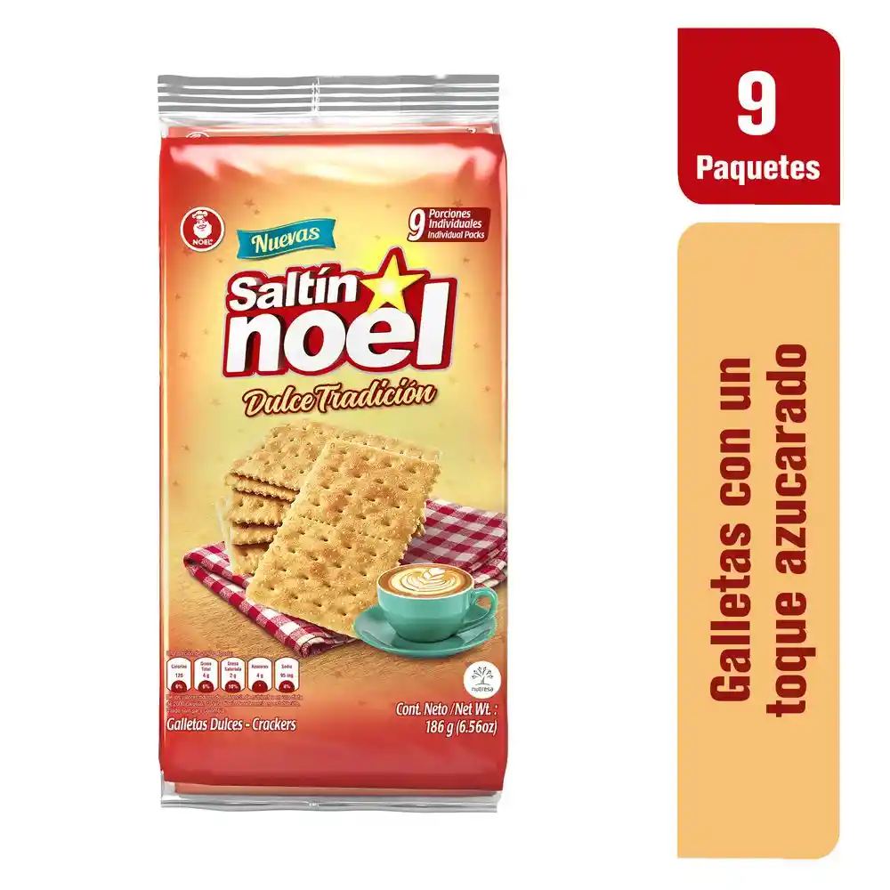 Además de deliciosas las galletas Saltín Noel Tradicional son fuente de vitamina B1 B2 y B3 Calcio hierro y ácido fólico lo que las convierte en el complemento ideal para una dieta sana y balanceada. El empaque contiene 9 paquetes de galletas perfectas para disfrutar y compartir con los que más quieres. Packing: Bolsa