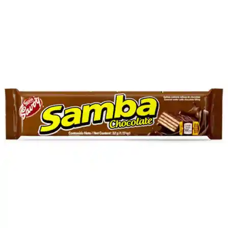 SAMBA® chocolate tiene el balance perfecto entre lo crujiente, un relleno de delicioso sabor a chocolate y la cobertura de chocolate SAVOY®. Ingredientes: Azúcar, Harina de Trigo, Grasa Vegetal, Manteca de Cacao (11%), Leche, Cacao en Polvo (8,5%), Lecitina de Soya (Emulsificante), Sabores a Chocolate, Etilvainilla y Vainillina (Sabores Artificiales), Sal y Bicarbonato de Sodio (Leudante). Uso: Ideal para un dulce momento de indulgencia. Aviso importante: Este producto puede contener Maní, Nuez de Brasil, Anacardo, Nuez de Macadamia, Nuez Pecana, Pistacho, Almendras, Avellanas y/o Nueces.