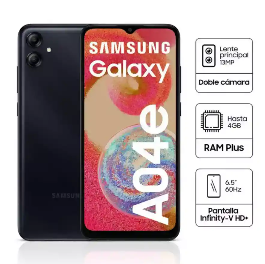 Celular Smartphone Samsung A04e con una pantalla HD+ un procesador Octa-core con ocho nucleos, con 4 de Ram, con expansion de 1Terabait por Micro SD y cuenta con una gran bateria de 5000 mAh. Viene con obsequio de forro anti-golpes y vidrio protector de pantalla