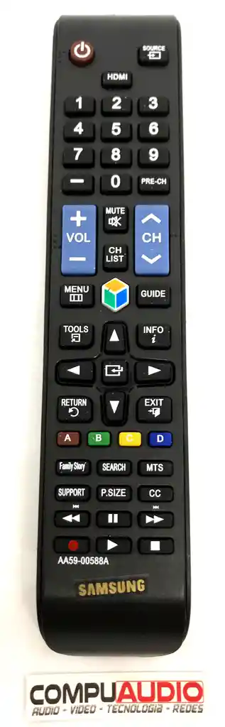 Control remoto para televisores Samsung, compatibilidad garantizada solo para televisores Samsung, no es universal, tiene boton de acceso directo Smart hub, entre otros, todas las funciones disponibles, maneja 2 pilas AAA (no incluidas). Versión genérica homologada
