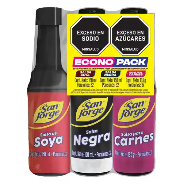 Contiene 3 Unidades. San Jorge Salsa Soya 160 mL + San Jorge Salsa Negra 160 mL + San Jorge Salsa Carne 185 mL.