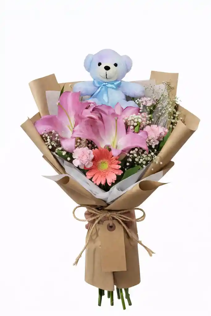 Ramo de estilo rústico y encantador que destaca por un suave osito de peluche azul de 18 cm, rodeado de la elegancia de 2 lirios rosados grandes, 1 gerbera de color vibrante y delicados claveles en tonos pastel. Acompañado de flores blancas tipo nube y follaje verde natural. Es el detalle rústico y tierno ideal para expresar cariño, gratitud o celebrar un momento especial con un toque muy natural 🐻🌸.