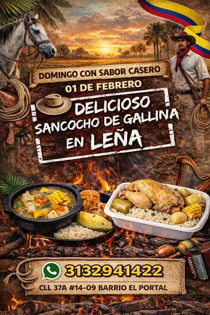 sancocho de gallina en leña ( 1 gallina, 4 sancochos, porcion de arroz)