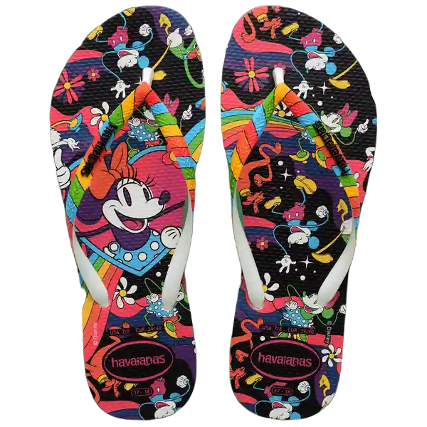 Con un Par. Minnie Tiene Más Estilo Que Nunca en Estas Havaianas Slim Disney Stylish. Los Dos Personajes Aparecen en la Mitad de Una Explosión de Colores Vibrantes Estampados en la Forma Más Amada de Havaianas Por Sus Tiras y Suelas Más Delgadas.