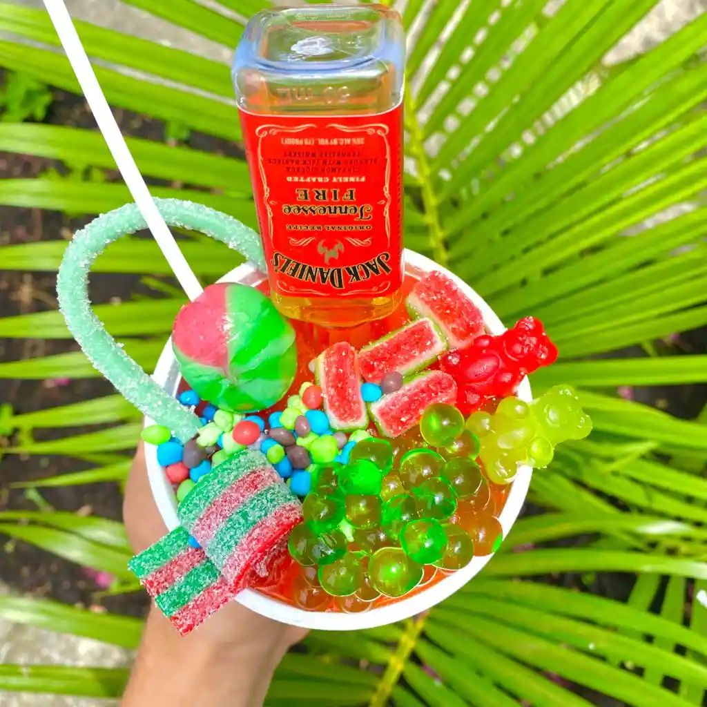 Granizado A Base De Whisky Con Sabor A Sandia, Acompañado De Toppings (Gomas Y Burbujas). . .
