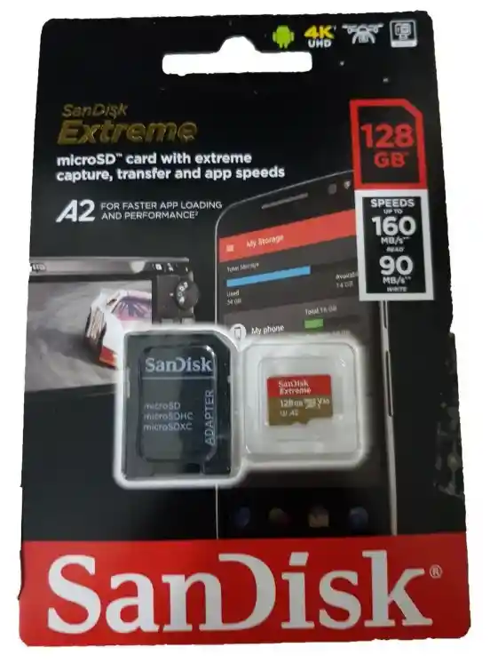 * Factor de forma: * Capacidades disponibles: 128 GB * Rendimiento/velocidad: velocidad de lectura de hasta 160 MB/s y escritura de hasta 90 MB/s * Velocidad del Video: C10, V30, U3, A2 * Dimensiones de la tarjeta: 0,59 in x 0,043 in x 0,04 in (14,99 mm x 10,92 mm x 1,02 mm) * Temperatura de funcionamiento: de -25 °C a 85 °C (de -13 °F a 185 °F) * Temperatura de almacenamiento: de -40 a 85 °C (de -40 a 185 °F) * Compatilidad: Compatible con dispositivos que admiten microSDHC, microSDXC, microSDHC UHS-I y microSDXC UHS-I * Clase 10, clase 3 de velocidad UHS (U3) y clase 30 de velocidad de video UHS (V30) para videos 4 K Ultra HD (3840 x 2160p) y full HD (1920 x 1080p) * Oferta de descarga del software de recuperación de datos RescuePRO® Deluxe ==================Descripción General Disfruta de velocidades extremas para una transferencia rápida, rendimiento de las aplicaciones y contenido 4K UHD. Esta tarjeta microSD™ de alto rendimiento es perfecta para los teléfonos inteligentes Android™ y cámaras de acción o drones, con capacidad de grabación de video 4K UHD, video full HD y fotos de alta resolución. La tarjeta de memoria superrápida SanDisk Extreme® microSDXC™ tiene una capacidad de lectura de hasta 160 MB/s* y de escritura de hasta 90 MB/s.* Además, es de clase A2, lo que aporta un rendimiento de las aplicaciones excelente para disfrutar de una experiencia excepcional con los teléfonos inteligentes. =========AHORRA TIEMPO TRANSFIRIENDO CONTENIDO Las rápidas velocidades de lectura de hasta 160 MB/s* te permiten transferir 1000 fotos de alta resolución y 30 minutos de video 4K (24 GB) en menos de 3 minutos =========VELOCIDADES DE ESCRITURA DE HASTA 90 MB/S* Captura fotos de acción rápida o filma videos 4K UHD con velocidades de escritura de hasta 90 MB/s.* La tarjeta SanDisk Extreme® microSDXC™ UHS-I te permite tomar más fotos y más rápido. =========PERFECTA PARA CAPTURAR VIDEO 4K UHD Resulta perfecta para grabar aventuras al aire libre, viajes de fin de semana o eventos deportivos sin omitir ni un solo fotograma. Con clasificaciones de velocidad UHS clase 3 (U3) y velocidad de video clase 30 (V30), las tarjetas SanDisk Extreme® microSD™ UHS-I de 400 GB te permiten capturar vídeos ininterrumpidos en calidad 4K UHD y full HD. =========CARGA APLICACIONES MÁS RÁPIDO CON CLASIFICACIÓN A2 Consigue un rendimiento de la aplicación más rápido para disfrutar de una excelente experiencia con los teléfonos inteligentes gracias a la tarjeta microSD SanDisk Extreme® con clasificación A2 =========DISEÑO DURADERO PARA USO EN AMBIENTES EXTREMOS Las tarjetas SanDisk Extreme® microSDHC™ y microSDXC™ UHS-I están diseñadas a prueba de golpes, resistente al agua, y a prueba de rayos X, para que puedas disfrutar de tus aventuras sin preocuparte por la durabilidad de tu tarjeta de memoria. =========COMPATIBLE CON EL LECTOR MOBILEMATE® USB 3.0 Gracias al lector de tarjetas MobileMate® USB 3.0 microSD™ con velocidades de transferencia de hasta 160 MB/s*, puedes mover archivos grandes rápidamente, mover muchos archivos rápidamente o simplemente hacer transferencias frecuentes de archivos mucho más rápido.