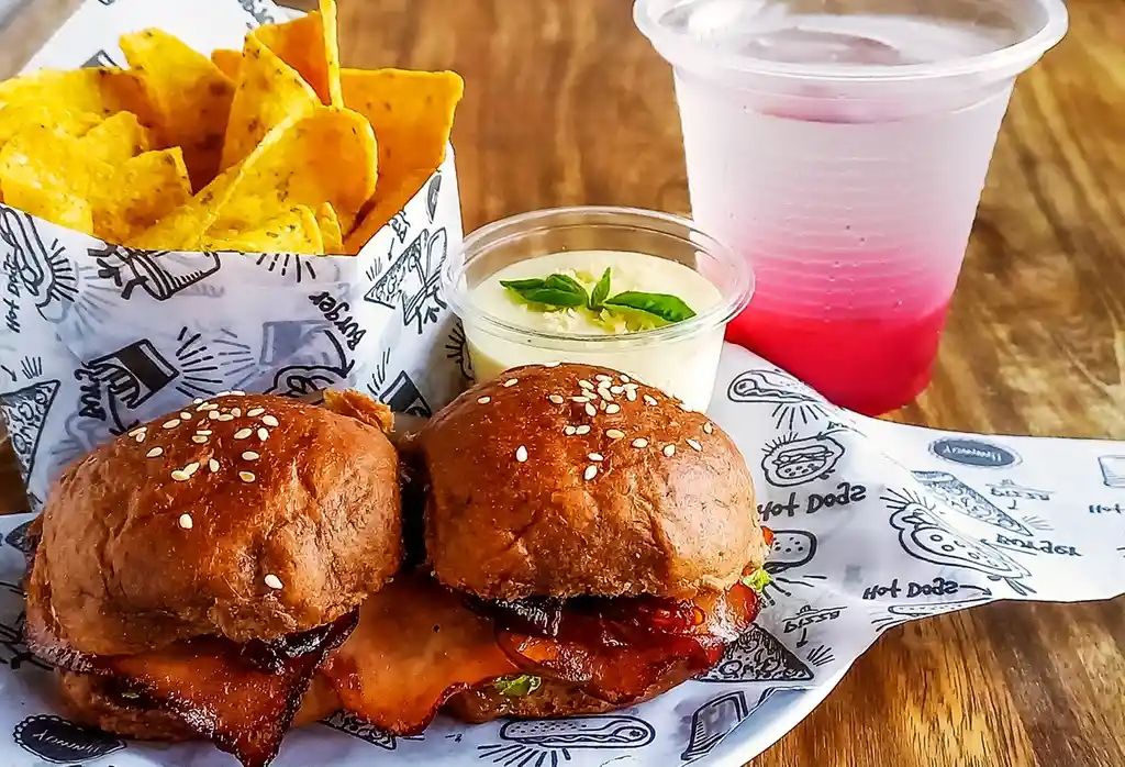 Sándwich de jamón y tocineta acompañado de queso mozzarella, ensalada tipo mezclum y cilantroza de aguacate en pan de cacao