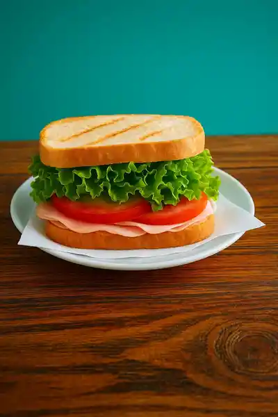 Sandwich de pollo desmechado, tomate, lechuga, jamón y queso doble crema.