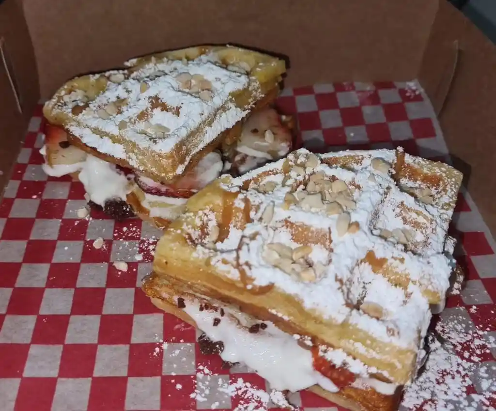 sándwich de Waffle recubierto con crema chantilly , leche condensada y azúcar pulverizada acompañado de duraznos en almíbar mango en trozos y maní