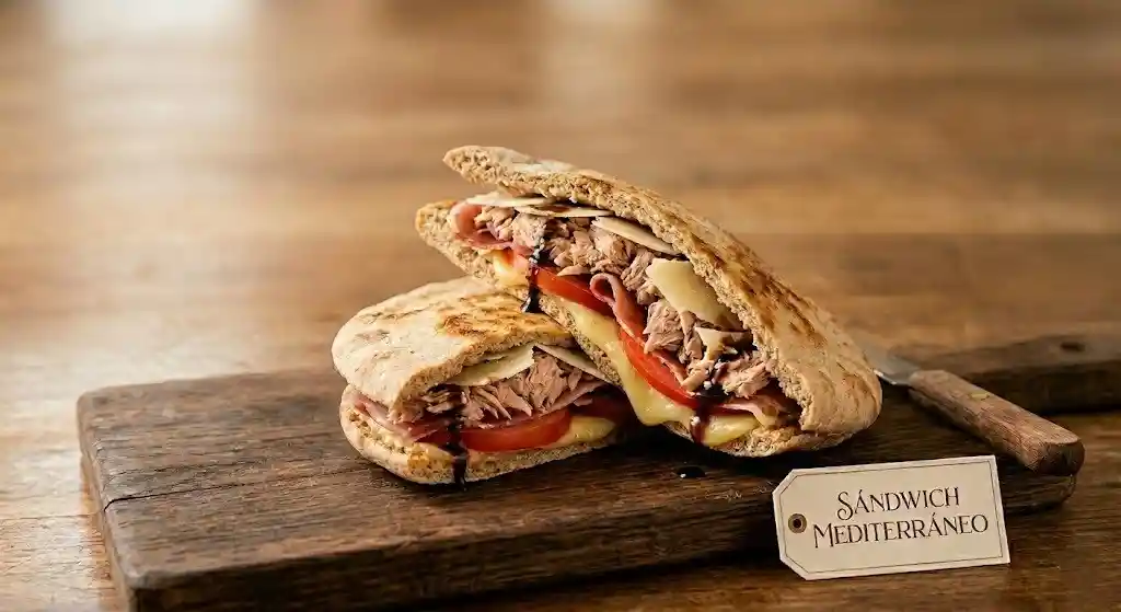 Ingredientes: Pan árabe, queso holandés tipo gouda, Atún, queso parmesano, jamón serrano, tomate, reducción de vinagre balsámico y aceite de oliva.