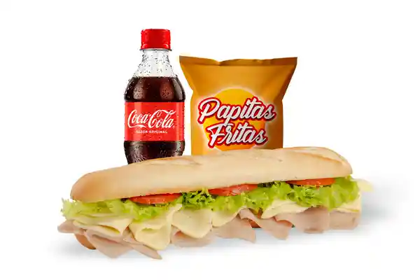Contiene 3 Unidades. Sándwich Pavo 1 Und + Coca-Cola Gaseosa 1 Und + Papas Naturales 1 Und.