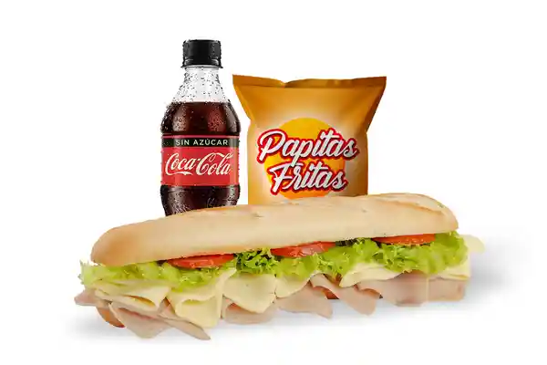 Contiene 3 Unidades. Sándwich Pavo 1 Und + Coca-Cola Gaseosa Sin Azúcar 1 Und + Papas Natural 1 Und.