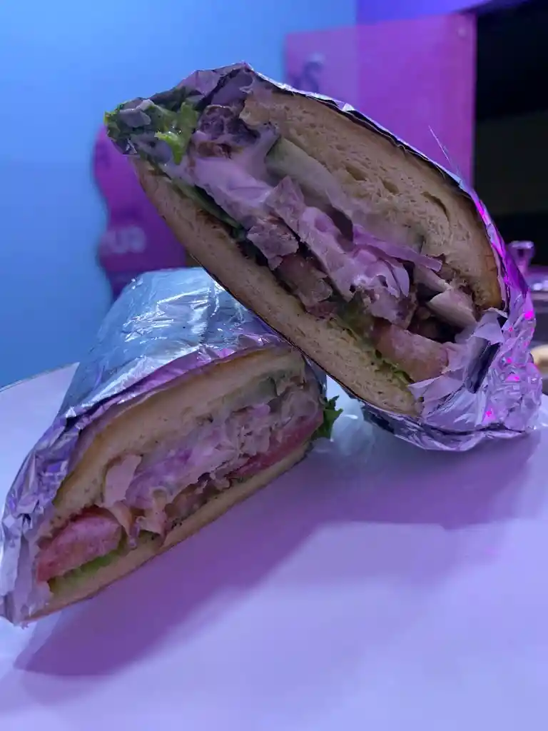 sandwich de jamon artesanal de cerdo, vegetales frescos, salsa de cilantro, queso, cebolla encurtida, pepinillos, pan artesanal.