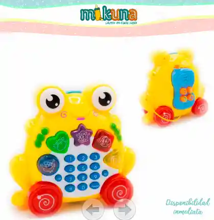 ideal para el aprendizaje de tu bebe, sapito para arrastrar, enseña las figuras, los colores, numeros entre otros,incluye un telefono para espichar y con sonidos, requiere baterias no incluidas.