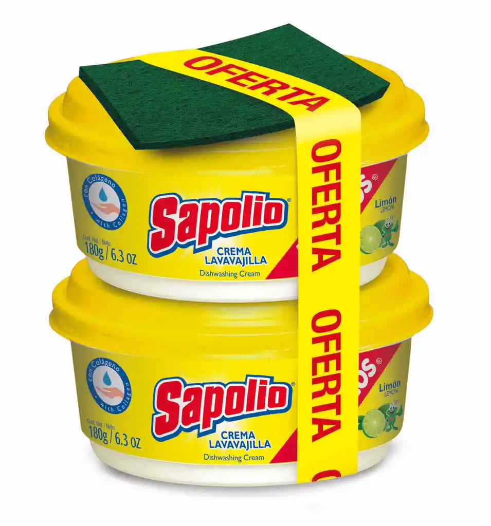 Crema lavavajilla con aroma a limón y colágeno, agente natural que rejuvenece la piel y evita sequedad, irritación y pequeñas heridas causadas por el lavado. Pack 2 unidades de 180 gramos. Lleva gratis esponja. packing: Pote