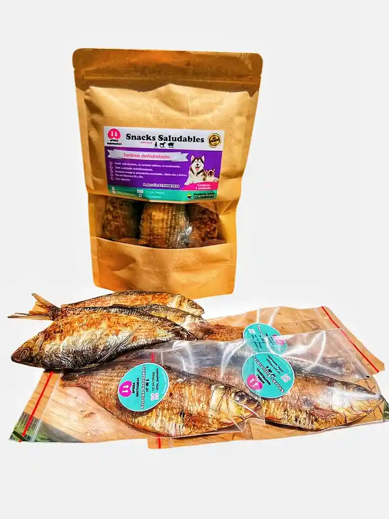 Sardinas Naturales Deshidratadas Snack natural para perros y gatos elaborado con sardinas deshidratadas. Ricas en omega-3 y proteínas, ideales para mejorar la piel, el pelaje y ofrecer un premio saludable. Beneficios -Fuente natural de omega-3 -100% sardina deshidratada -Apto para perros y gatos -Alta palatabilidad Ingredientes Sardinas enteras deshidratadas sin aditivos. Modo de uso Servir como snack diario o premio ocasional. Presentación: Bolsa 60gr