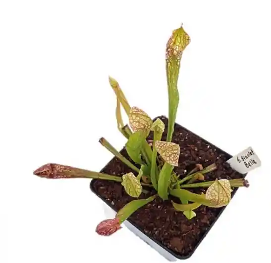 Híbrido de jarra compacta (S. Leucophylla y S. Psittacina). Sus tubos más cortos están rayados con un hermoso rojo brillante. La parte superior se extiende en una capucha larga y protege la entrada a la trampa, tiene una altura de 40 a 50 cm. Le gusta la buena luz, pero evita el sol abrasador del mediodía, y puede aguantar temperaturas desde los -15 °C hasta 35 °C.
